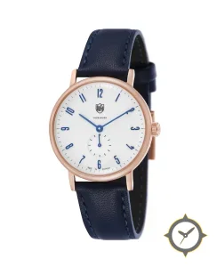A Dress watch with a vintage-inspired 37.5mm case, crafted from gold featuring a white dial with a unique enamel lacquer (smooth) finish.
