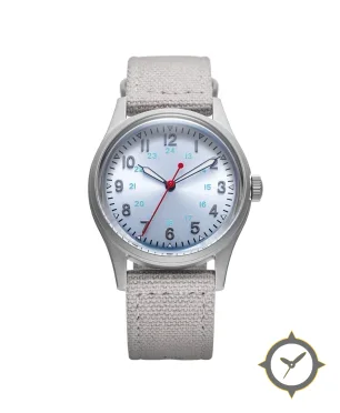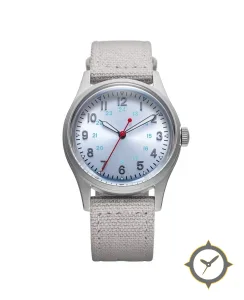 A Field watch with a vintage-inspired 37.5mm case, crafted from stainless steel featuring a silver dial with a unique sunburst finish.