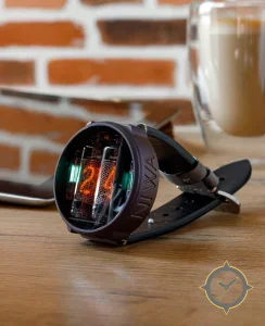 A Vintage watch with a bold 52.5mm presence on the wrist, crafted from stainless steel featuring a black dial with a unique transparent crystal exposing Nixie tubes finish.