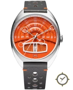 A Racing watch with a vintage-inspired 35.5mm case, crafted from stainless steel featuring a orange dial with a unique stepped concentric ridges (textured concentric rings) finish.
