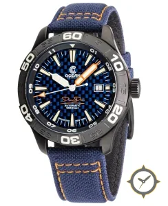 A Dive watch with a bold 51mm presence on the wrist, crafted from Coating featuring a blue dial with a unique carbon-fiber weave (textured) finish.