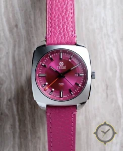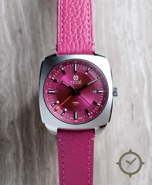 A GMT watch with a versatile 40.5mm case, that suits most wrists, crafted from stainless steel featuring a crimson dial with a unique sunburst finish and a true GMT complication for tracking a second time zone.