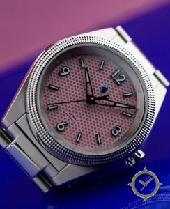 A Sports watch with a vintage-inspired 29mm case, crafted from stainless steel featuring a purple dial with a unique perforated / honeycomb texture finish.
