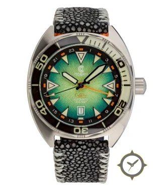 A Dive watch with a bold 47mm presence on the wrist, crafted from stainless steel featuring a turquoise dial with a unique sunburst finish and a true GMT complication for tracking a second time zone.