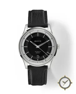 A Minimalist watch with a vintage-inspired 36.5mm case, crafted from stainless steel featuring a black dial with a unique matte finish.