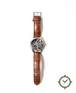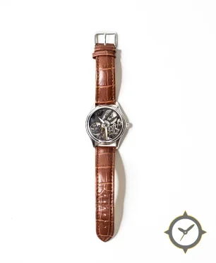 A Skeleton watch with a bold 46mm presence on the wrist, crafted from stainless steel featuring a black dial with a unique open-worked (skeletonised) finish.
