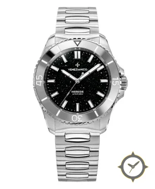 A Dive watch with a vintage-inspired 32.5mm case, crafted from stainless steel featuring a black dial with a unique aventurine (sparkle) finish.