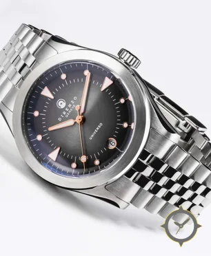 A Sports watch with a vintage-inspired 35mm case, crafted from stainless steel featuring a gray dial with a unique sunburst / fumé gradient finish.