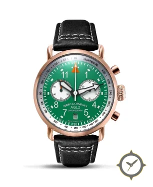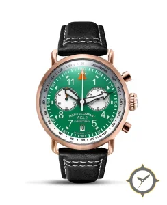 A Chronograph watch with a bold 46mm presence on the wrist, crafted from gold featuring a green dial with a unique sunburst finish.