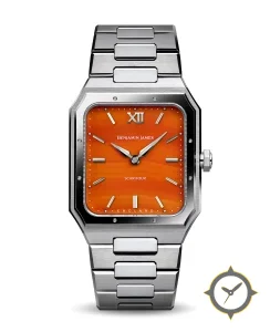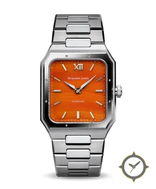 A Sports watch with a bold 44.5mm presence on the wrist, crafted from stainless steel featuring a orange dial with a unique lacquer finish.