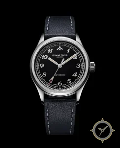 A Pilot watch with a vintage-inspired 36mm case, crafted from stainless steel featuring a black dial with a unique matte-lacquer finish.