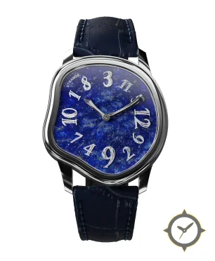 A Luxury watch with a vintage-inspired 9mm case, crafted from stainless steel featuring a blue dial with a unique lapis-lazuli stone / marbled texture finish.