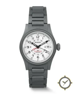 A GMT watch with a vintage-inspired 36mm case, crafted from titanium featuring a white dial with a unique matte finish and a true GMT complication for tracking a second time zone.