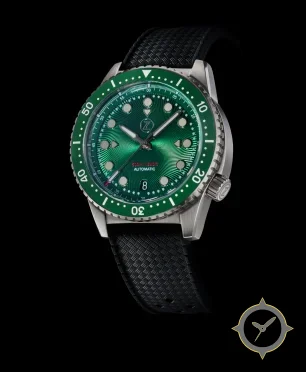 A Dive watch with a vintage-inspired 33mm case, crafted from stainless steel featuring a green dial with a unique sunburst guilloche with radial wave engraving finish.