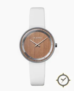 A Minimalist watch with a vintage-inspired 36.5mm case, crafted from stainless steel featuring a brown dial with a unique wood finish and a true GMT complication for tracking a second time zone.
