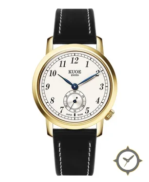 A Dress watch with a vintage-inspired 34mm case, crafted from gold featuring a white dial with a unique matte lacquer finish.