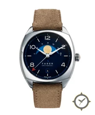 A Dress watch with a vintage-inspired 34mm case, crafted from stainless steel featuring a navy dial with a unique sunburst finish and a beautiful moonphase display.