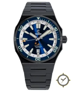 A Dive watch with a vintage-inspired 36mm case, crafted from stainless steel featuring a blue dial with a unique sunburst finish.