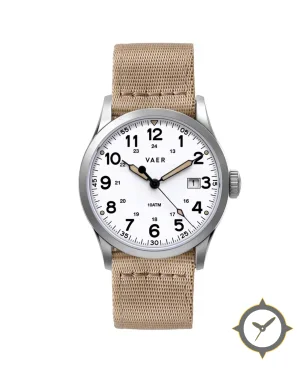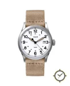 A Field watch with a vintage-inspired 36mm case, crafted from stainless steel featuring a white dial with a unique matte finish.