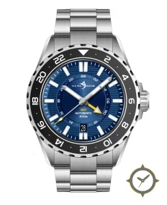 A GMT watch with a vintage-inspired 37mm case, crafted from stainless steel featuring a blue dial with a unique sunburst center with horizontal ribbed/striped texture finish and a true GMT complication for tracking a second time zone.