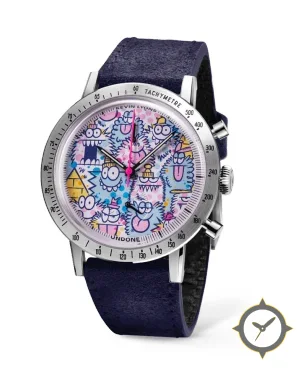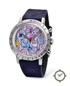 A Racing watch with a versatile 39.5mm case, that suits most wrists, crafted from stainless steel featuring a purple dial with a unique printed cartoon illustration finish.