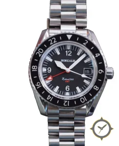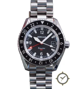 A GMT watch with a bold 270mm presence on the wrist, crafted from stainless steel featuring a black dial with a unique matte finish and a true GMT complication for tracking a second time zone.