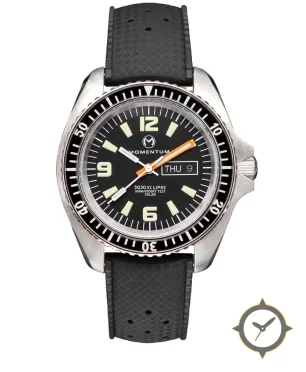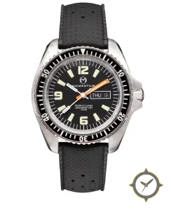 A Dive watch with a bold 42mm presence on the wrist, crafted from stainless steel featuring a black dial with a unique matte finish.