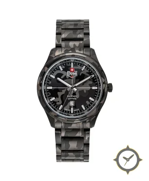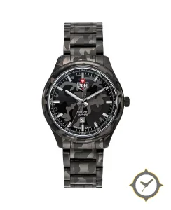 A Military watch with a bold 47mm presence on the wrist, crafted from stainless steel featuring a black dial with a unique camouflage finish.