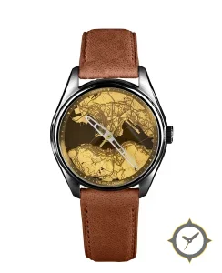 A Dress watch with a vintage-inspired 34mm case, crafted from stainless steel featuring a gold dial with a unique engraved map finish.
