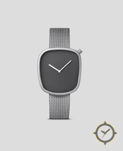 A Minimalist watch with a bold 46mm presence on the wrist, crafted from stainless steel featuring a gray dial with a unique matte finish.