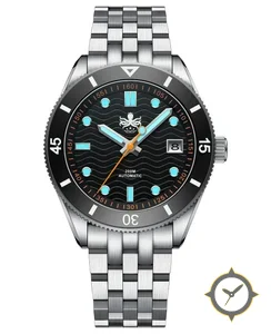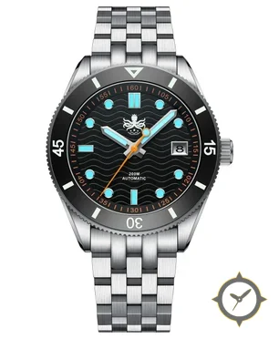 A Dive watch with a bold 44mm presence on the wrist, crafted from stainless steel featuring a black dial with a unique wavy/engraved finish finish.