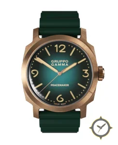 A Military watch with a versatile 38.5mm case, that suits most wrists, crafted from bronze featuring a green dial with a unique fumé sunburst (gradient) finish.