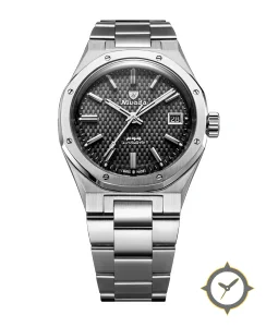 A Luxury watch with a vintage-inspired 32mm case, crafted from stainless steel featuring a black dial with a unique carbon fiber finish.