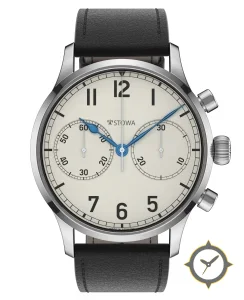 A Chronograph watch with a vintage-inspired 35mm case, crafted from stainless steel featuring a white dial with a unique subtle grained/ivory matte texture finish.