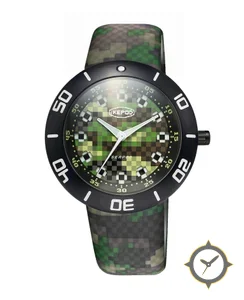 A Dive watch with a versatile 38mm case, that suits most wrists, crafted from stainless steel featuring a green dial with a unique pixelated camouflage finish.