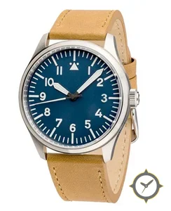 A Pilot watch with a bold 43mm presence on the wrist, crafted from stainless steel featuring a blue dial with a unique matte finish.