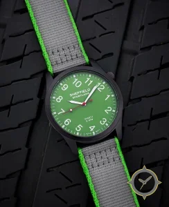 A Field watch with a vintage-inspired 33.5mm case, crafted from stainless steel featuring a green dial with a unique matte finish.