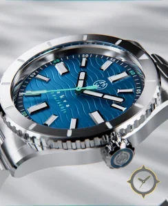 A Dive watch with a bold 42.5mm presence on the wrist, crafted from stainless steel featuring a blue dial with a unique embossed wave texture finish.