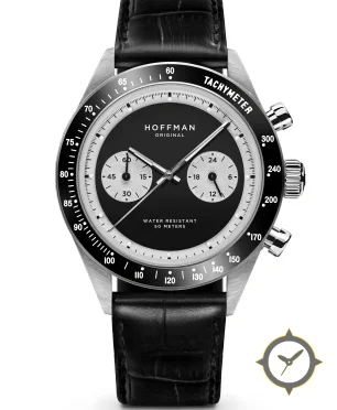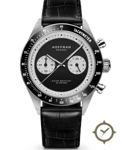 A Chronograph watch with a bold 44.5mm presence on the wrist, crafted from stainless steel featuring a black dial with a unique matte, two-tone with lighter outer ring finish.