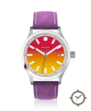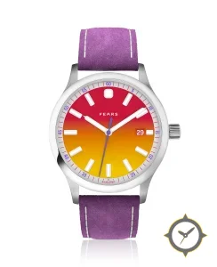 A Sports watch with a vintage-inspired 33.5mm case, crafted from stainless steel featuring a orange dial with a unique red-to-yellow gradient finish.