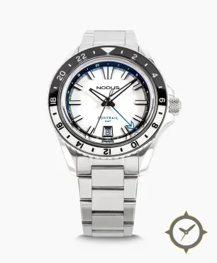 A GMT watch with a bold 46.5mm presence on the wrist, crafted from stainless steel featuring a white dial with a unique lacquer finish and a true GMT complication for tracking a second time zone.
