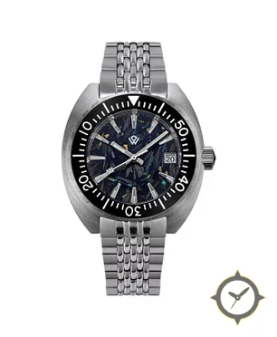 A Dive watch with a versatile 39mm case, that suits most wrists, crafted from stainless steel featuring a black dial with a unique iridescent fragmented abalone / mother-of-pearl effect finish.