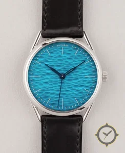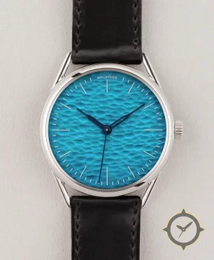 A Dress watch with a bold 41.5mm presence on the wrist, crafted from stainless steel featuring a turquoise dial with a unique hammered / rippled texture finish.
