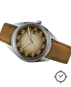A Pilot watch with a vintage-inspired 37mm case, crafted from stainless steel featuring a brown dial with a unique fumé/gradient (sunburst) finish.