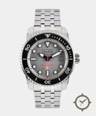 A Dive watch with a bold 46mm presence on the wrist, crafted from stainless steel featuring a gray dial with a unique matte finish.