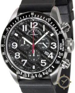A Chronograph watch with a bold 53mm presence on the wrist, crafted from stainless steel featuring a black dial with a unique carbon fiber weave finish.