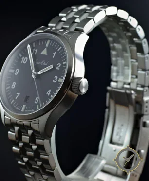 A Pilot watch with a bold 45.5mm presence on the wrist, crafted from stainless steel featuring a black dial with a unique matte finish.