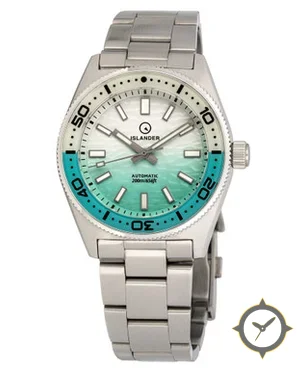 A Dive watch with a vintage-inspired 32.5mm case, crafted from stainless steel featuring a turquoise dial with a unique gradient fading from white at 12 o'clock to turquoise at 6 o'clock with a subtle wave texture finish.