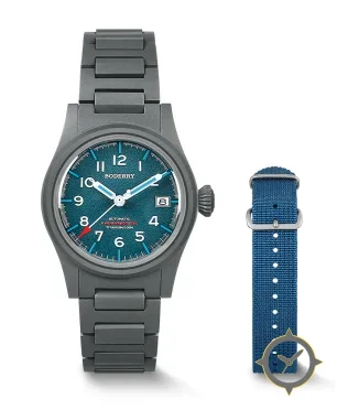 A Field watch with a vintage-inspired 36mm case, crafted from titanium featuring a blue dial with a unique grained/textured finish.
