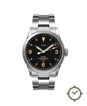 A Field watch with a vintage-inspired 35.5mm case, crafted from stainless steel featuring a black dial with a unique matte finish.